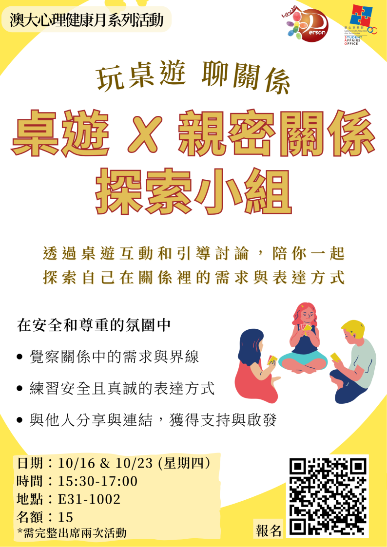 桌遊 X 親密關係探索 (2025/10/16 & 23, 週四) Gallery 桌遊 X 親密關係探索 (2025/10/16 & 23, 週四)senghangl Lei Seng Hang2025-09-29T17:40:39+08:0029 9 月, 2025| Read More